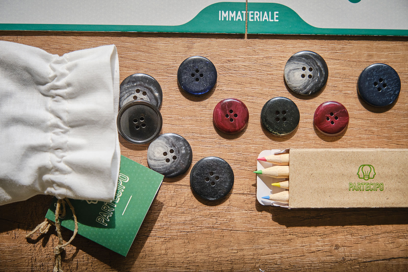 SACCHETTO CON BOTTONI, MATITE E POST-IT